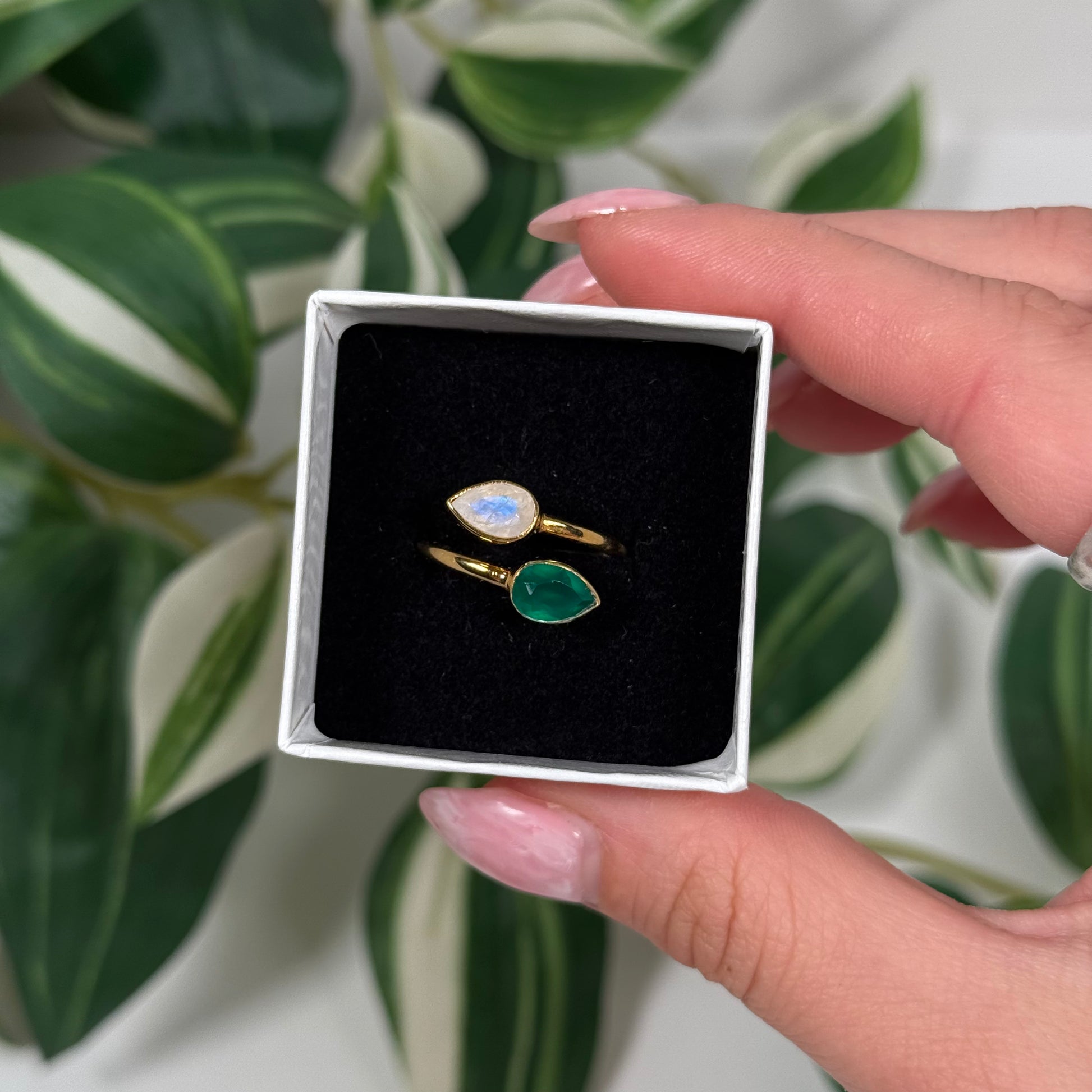 Gold plated rainbow moonstone/green onyx ring (size 7, 8)
